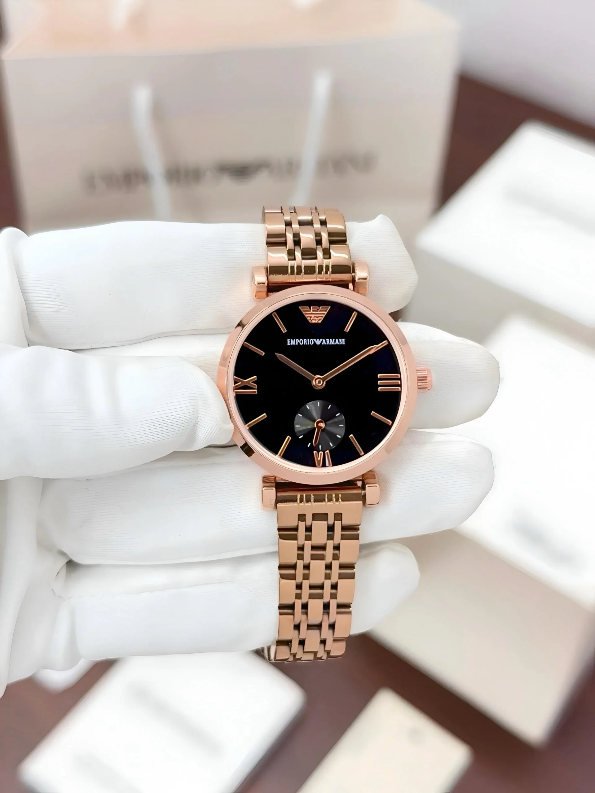 Overall, the Emporio Armani Slim Rose Gold Diamond Black Dial first copy Watch is a perfect combination of style, shine, and reliable performance. It is an ideal choice for women who appreciate timeless elegance blended with modern sophistication.